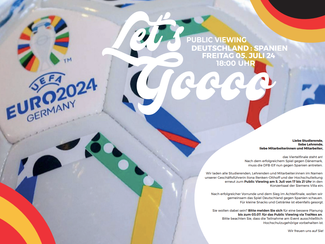 Nach dem erfolgreichem Spiel gegen Dänemark, muss die DFB-Elf nun gegen Spanien antreten. Wir laden alle Studierenden, Lehrenden und Mitarbeiter:innen im Namen unserer Geschäftsführerin Ilona Renken-Olthoff und der Hochschulleitung erneut zum Public Viewing am 5. Juli von 17 bis 21 Uhr in den Konzertsaal der Siemens Villa ein.
